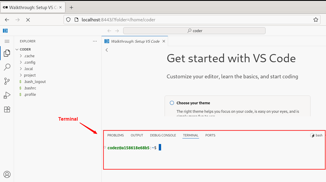 Terminál je umístěn ve spodní části kódového serveru. Můžete jej otevřít z horní nabídky „Terminál -> Nový terminál“ nebo stisknutím Ctrl + `.
