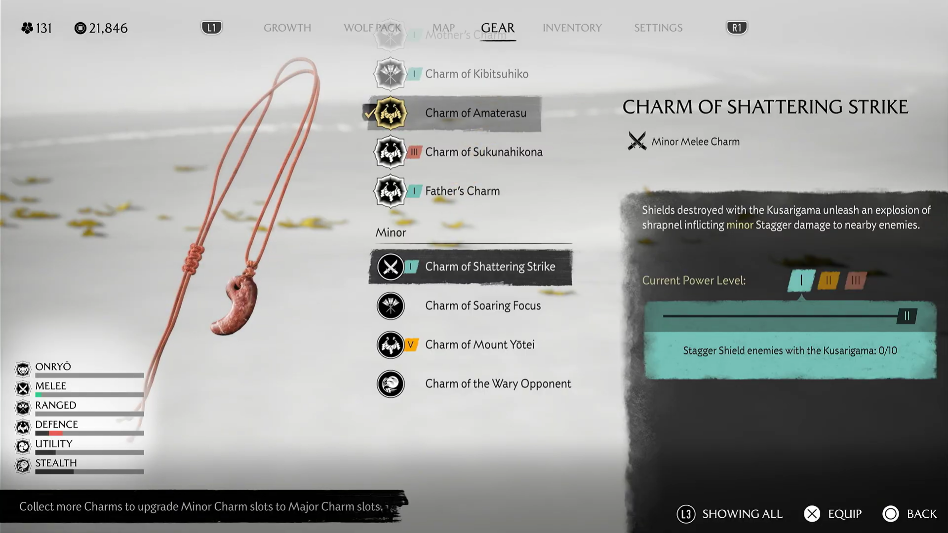 Po vyčištění oblasti seberte svou hlavní odměnu:Charm of Shattering Strike, která upgraduje Kusarigamu, aby rozbíjela nepřátelské štíty výbušnými efekty.