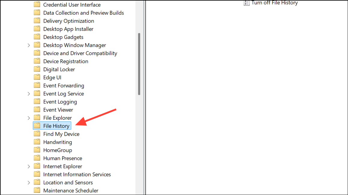 Krok 2:V levém podokně přejděte naKonfigurace počítače > Šablony pro správu > Součásti systému Windows > Historie souborů. Tato část obsahuje zásady specifické pro funkci Historie souborů.