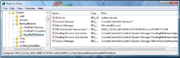 HKEY_LOCAL_MACHINE\System\ControlSet001\Control\BackupRestore\KeysNotToRestore