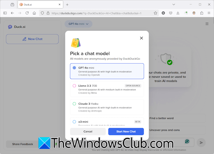 DuckDuckGoje oblíbený soukromý vyhledávač. Nyní podporuje vyhledávání AI. V DuckDuckGo můžete použít různé modely umělé inteligence k vyhledání požadovaných informací, aniž byste se museli registrovat pomocí svého účtu. Navštivte DuckDuckGo ve svém webovém prohlížeči a klikněte naPovídánímožnost na pravé horní straně. Nyní vyberte požadovaný model umělé inteligence z rozevíracího seznamu a klikněteZahájit nový chat.