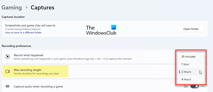 Ano, chcete-li prodloužit dobu nahrávání na pozadí nad výchozích 30 sekund, otevřeteNastaveníaplikaci stisknutímWindows + I. Přejít naHry > Snímky. Ujistěte se, že 'Zaznamenejte, co se staloPřepínač je nastaven naNaa kliknutím na šipku dolů zobrazíte další možnosti. HledatZaznamenejte poslednía vyberte delší dobu trvání. Můžete si vybrat 1 minutu, 3 minuty, 5 minut, 10 minut nebo dokonce až 10 minut, v závislosti na vašich preferencích.