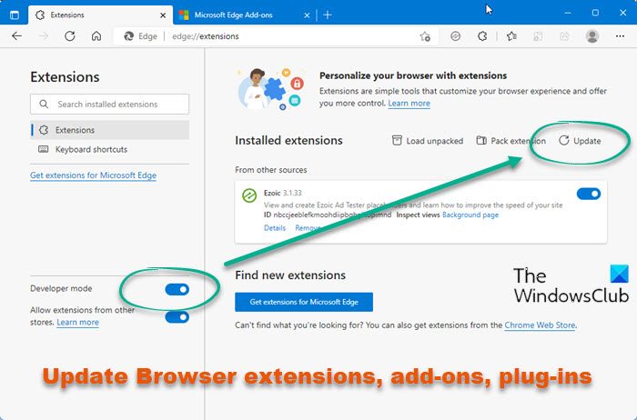 - Kliknutím na tlačítko Aktualizovat aktualizujete všechna nainstalovaná rozšíření nebo doplňky.