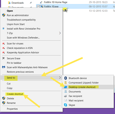 - Klikněte na Odeslat > Plocha (Vytvořit zástupce)