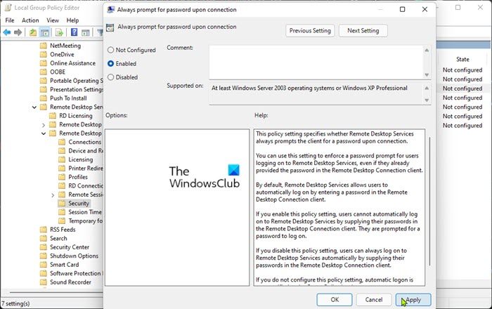 Chcete-li povolit nebo zakázat při připojení ke vzdálené ploše k počítači se systémem Windows 11/10 pomocí Editoru místních zásad skupiny vždy zobrazit výzvu k zadání hesla, postupujte takto: