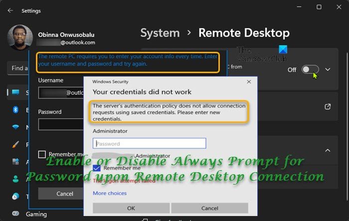 Ve výchozím nastavení, když klientský počítač se systémem Windows 11 nebo Windows 10 úspěšně naváže připojení ke vzdálené ploše k hostitelskému počítači, použité přihlašovací údaje se poté uloží, aby bylo možné automatické připojení v následujících připojeních. připojit k počítači – to může představovat bezpečnostní riziko pro váš počítač. V tomto příspěvku vám ukážeme, jak na topovolit nebo zakázat při připojení ke vzdálené ploše vždy vyžadovat heslodo Windows PC.