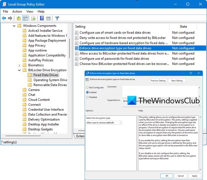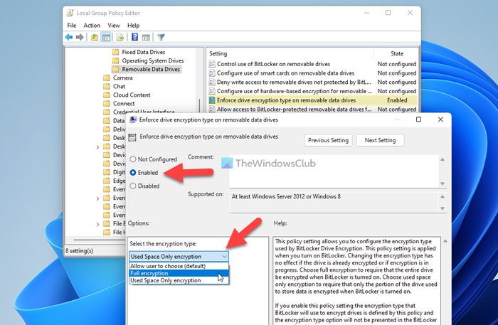 Pokud nemůžete povolit šifrování pro vyměnitelné jednotky, můžete to provést pomocí Editoru místních zásad skupiny nebo Editoru registru. Tato příručka vysvětluje, jak můžetevynutit šifrování jednotky BitLocker pro odebrání datových jednotek nebo pevných datových jednoteka vyberte konkrétní typ šifrování. Pro vaši informaci, proces je stejný ve Windows 11 a Windows 10.