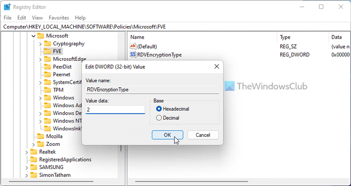 Poté klikněte pravým tlačítkem naFVE > Nový > Hodnota DWORD (32bitová).a pojmenuj to jakoRDVEncryptionType.