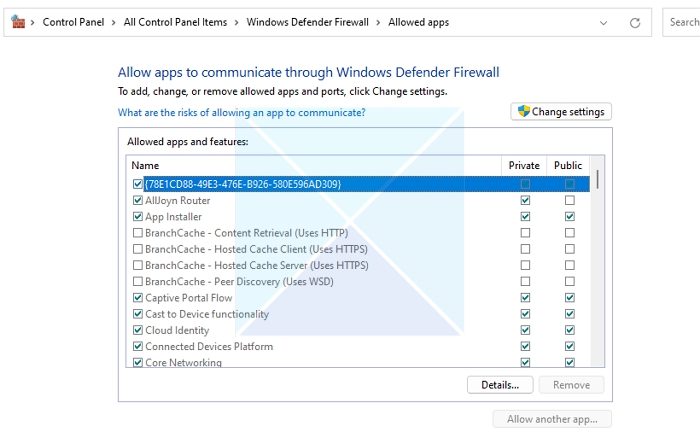 - KlikněteZměňte nastaveníprvní. Poté vPovolené aplikace a funkceProjděte prosím seznam níže a vyhledejteAplikace Vzdálená plochaa zaškrtněte ji. Klepněte na tlačítko OK.
