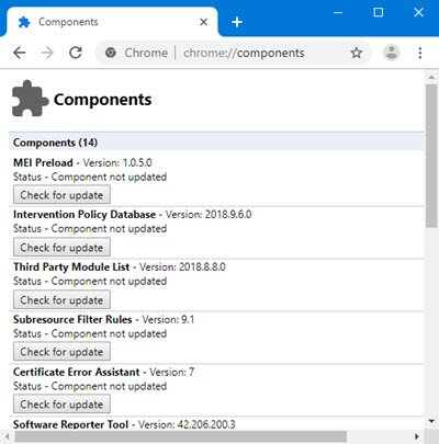 nejnovějšíChromewebový prohlížeč je dodáván s novýmchrome://komponentystránku, kterou můžete načíst v prohlížeči Chrome a získat informace o dostupných komponentách.