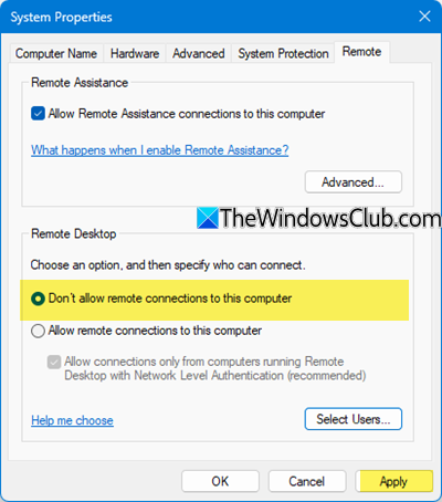 - Vzdálený přístup můžete zakázat otevřením pole Spustit a zadánímSystemPropertiesRemote.exea stisknutím klávesy Enter. Tady to zajistěteNepovolovat vzdálená připojení k tomuto počítačije vybráno.