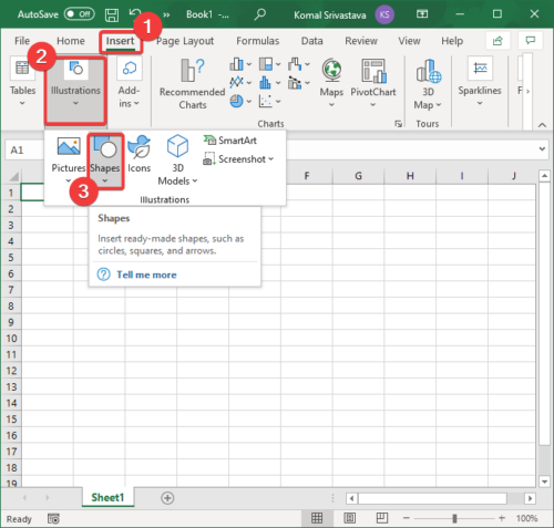 Otevřete Microsoft Excel, přejděte naVložita klikněte na Ilustrace > Tvaryvolba.
