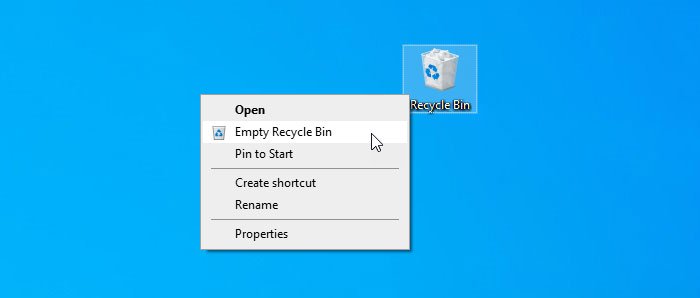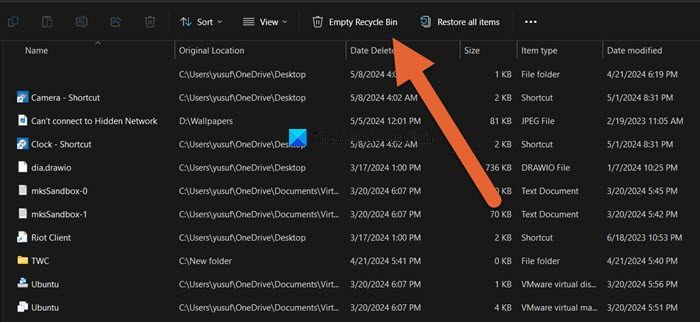 Koš obsahuje všechny vaše smazané soubory, takže pokud se rozhodnete je získat zpět, vše, co musíte udělat, je obnovit danou položku odtud. Ale pokud jste si jisti, že tyto položky nepotřebujete zpět, podívejte se na metody uvedené v tomto příspěvkuvyprázdněte koš ve Windows 11/10.