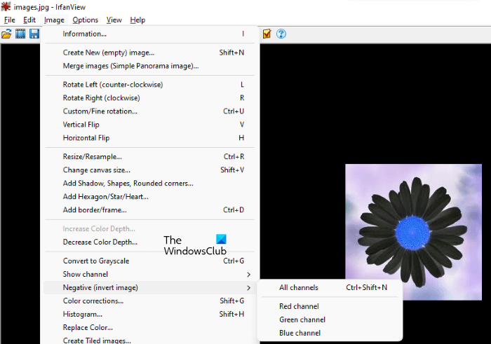 - Nyní přejděte na „Obraz > Negativní (obrácený obraz) > Všechny kanály.“ Poté IrfanView invertuje barvy obrázku.