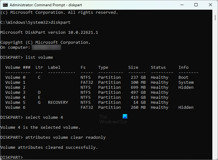 Zadejte správné číslo diskového oddílu ve výše uvedeném příkazu místo #. Po vymazání atributu jen pro čtení se zobrazí následující zpráva.