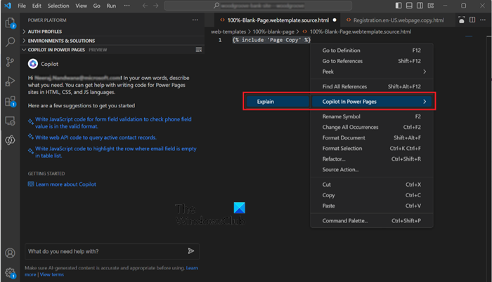 Nagenerovat kódy pomocí Copilota,musíte popsat chování kódu, které chcete, pomocí přirozeného jazyka v chatboxu. Například kód pro ověření formuláře nebo volání Ajax pomocí webového rozhraní API Power Pages. Poté můžete svou otázku upravit podle toho, co potřebujete. Jakmile získáte to, co hledáte, zkopírujte kód a použijte jej, kdekoli je potřeba.