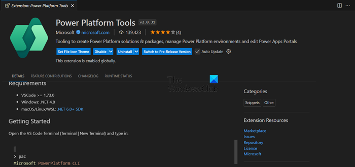 Abychom mohli začít, musíme nejprve získat nejnovější rozšíření Power Platform Tools. Chcete-li to získat, musíte přejít na stránku Rozšíření a vyhledat"Nástroj Power Platform"a poté klikněte na tlačítko Instalovat. Po instalaci spusťte Visual Studio Code a otevřete kořenovou složku webu. Poté se přihlaste k Power Pages Copilot pomocí přihlašovacích údajů Dataverse Environment.