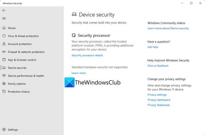 V Zabezpečení systému Windows můžete také najít vyhrazenou kartu s názvem Zabezpečení zařízení, která vám poskytuje přehled o integrovaných funkcích zabezpečení ve vašem zařízení. Mezi bezpečnostní prvky patří, Bezpečnostní procesor a Bezpečné spouštění. Bezpečnostní procesor () a.