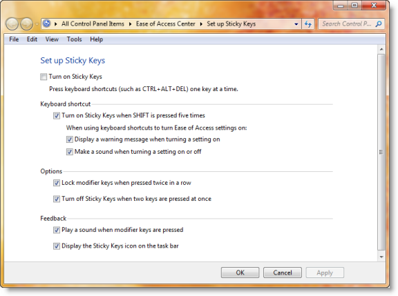 Aktivujte nebo deaktivujte Sticky Keys prostřednictvím ovládacího panelu