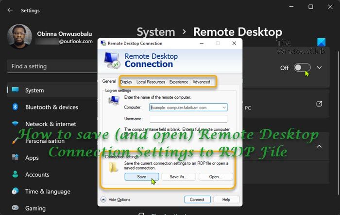 Chcete-li uložit nastavení připojení ke vzdálené ploše do souboru RDP v systému Windows 11/10, postupujte takto: