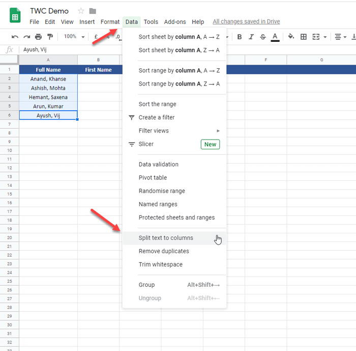 V tomto případě nejsou Tabulky Google tak chytré jako Microsoft Excel. Ačkoli můžete rozdělit všechny texty oddělené čárkami, nemůžete zachovat zdrojový sloupec. Pokud jste s tím v pořádku, měli byste projít těmito kroky.