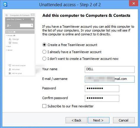 Klikněte na „Další“ a budete požádáni o přidání počítače do seznamu Počítač a kontakty. Musíte vybrat svůj stávající účet TeamViewer nebo vytvořit nový.