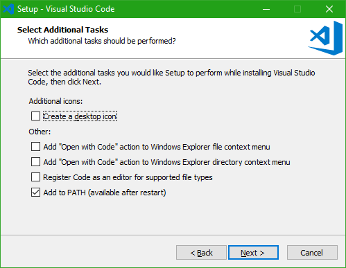 Nyní se vás stránka zeptá, zda chcete vytvořit položku složky nabídky Start pro kód Visual Studio. Podle vašich preferencí si nyní můžete vybrat, zda chcete nebo nechcete vytvořit položku nabídky Start pro kód VS.