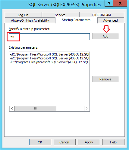 Klik på i SQL Server 2014 eller 2012Opstartsparametrefanen. Type-miAngiv en startparameterboksen og klik derefterTilføje.