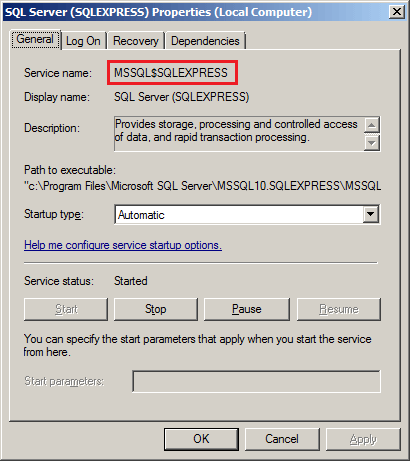 Find din ønskede SQL Server-tjeneste på listen, dobbeltklik på den. Dette åbner dialogboksen Egenskaber for den pågældende tjeneste. Kopier tjenestenavnet, der er angivet der. I mit eksempel er tjenestenavnet MSSQL$SQLEXPRESS.
