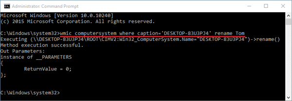 WMIC computersystem where caption='current_pc_name' rename new_pc_nameErstat current_pc_name med dit nuværende computernavn og new_pc_name med dit ønskede nye computernavn.