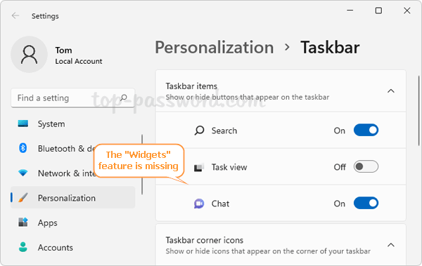 Personalization -> Taskbar. Til højre skal du slå kontakten ved siden afWidgets.