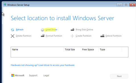 På skærmen, hvor du skal vælge en disk for at installere operativsystemet, vil du se, at Windows Setup ikke registrerede din virtuelle harddisk. Problemet er, at Windows-billedet ikke indeholder drivere til VirtIO SCSI-controlleren.