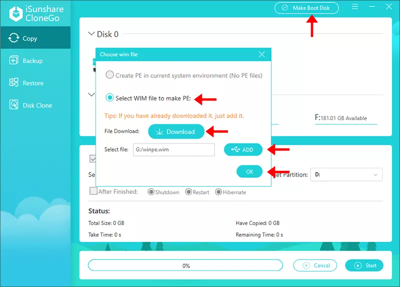 Trin 2:Sæt kryds ved muligheden -Vælg WIM-fil for at lave PE. Klik derefter påDownloadknap. Efter download skal du udpakke ZIP-filen og tilføje WIM-fil. Klik derefter påOKknap.