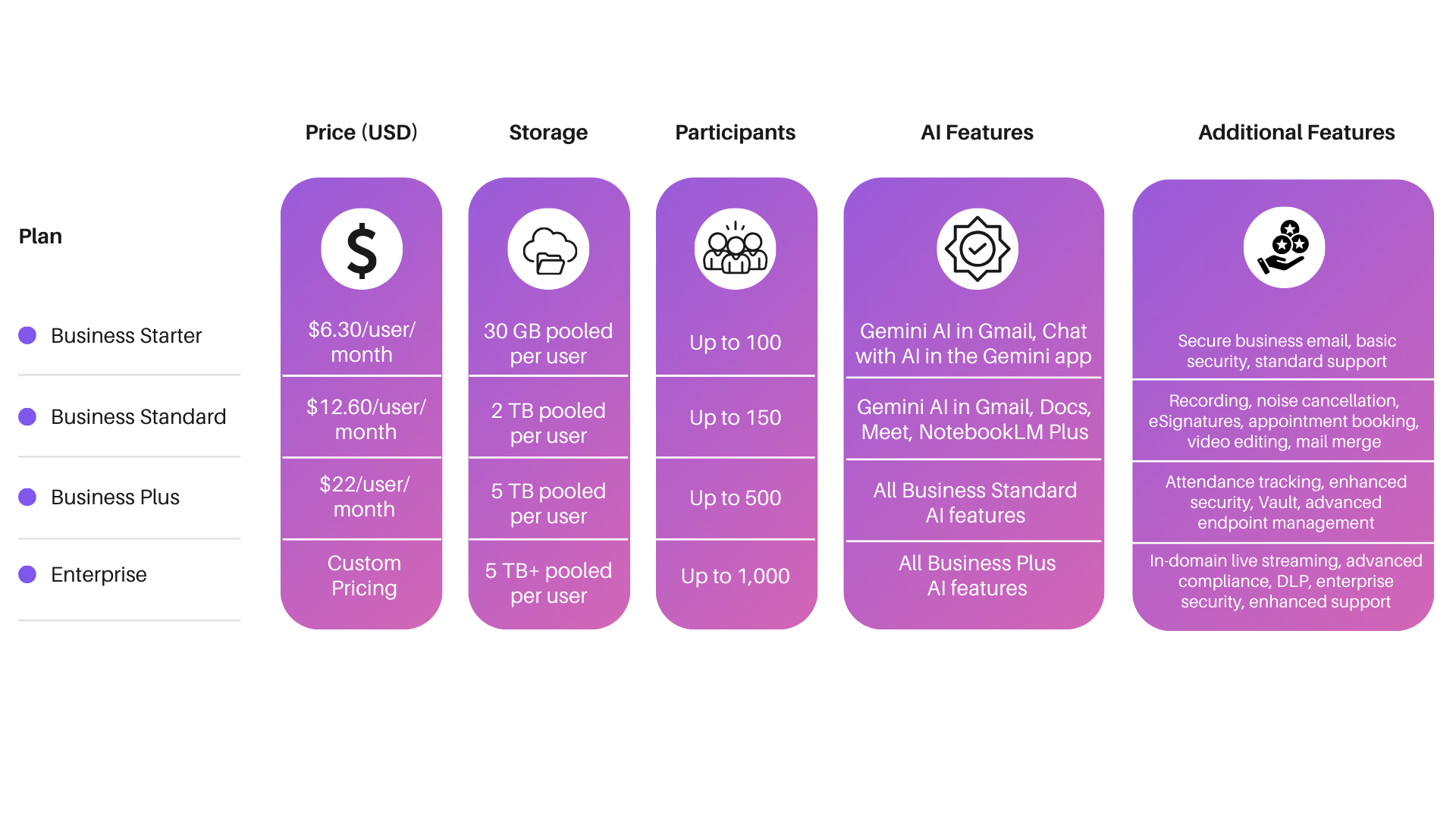 Ja, alle betalte planer inkluderer AI-værktøjer. Business Starter har Gemini AI i Gmail, mens Business Standard og derover tilbyder NotebookLM Plus, støjreduktion og AI-transskription til smartere møder og arbejdsgange.