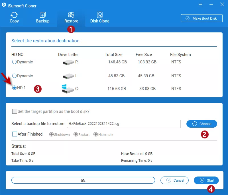 Trin 1: Kør iSoft Cloner og vælgGendanmulighed for at gendanne Windows 10 fra USB.