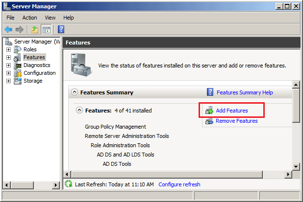 - Under Server Manager-vinduet skal du klikke påTilføj funktionerlink fra sektionen med oversigt over funktioner.
