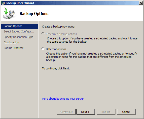 - Det vil åbne guiden Backup Once, vælgForskellige mulighederog klik derefterNæste.