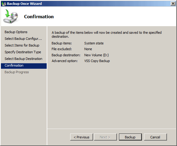 - I det næste vindue skal du bekræfte de indstillinger, du har valgt, og derefter klikke påBackup.