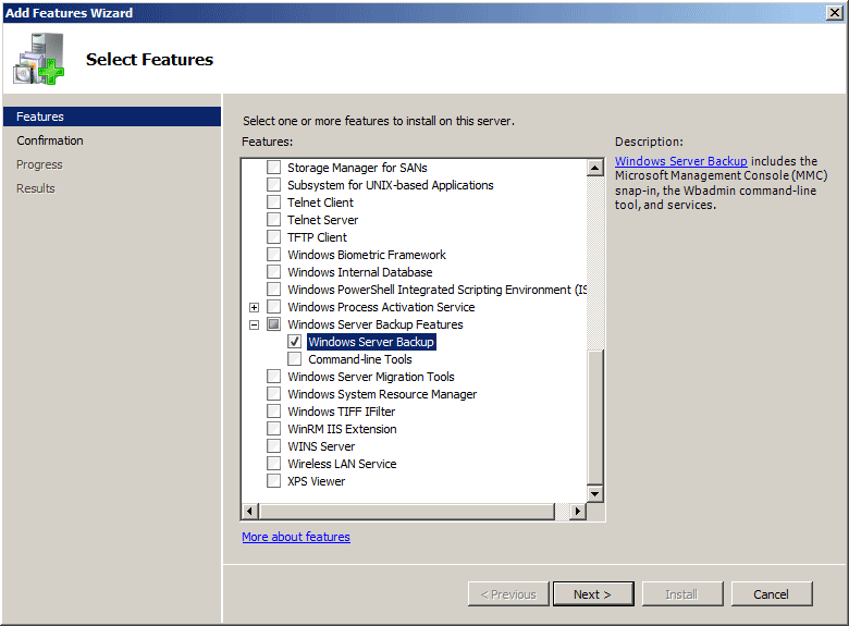 - VælgWindows Server Backup-funktioner, og klik derefter på Næste. Kommandolinjeværktøjerne giver dig mulighed for at udføre en DC backup og gendannelse fra kommandolinjen.