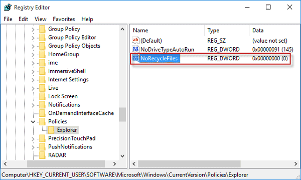 Trin 2: Gå tilComputerHKEY_CURRENT_USERSOFTWAREMicrosoftWindowsCurrentVersionPoliciesExplorer. NårExplorernøgle er valgt, højreklik på det tomme område i højre rude, og vælgNy>DWORD (32-bit) værdiat skabe ny værdi. Navngiv den nye værdiNoRecycleFiles.