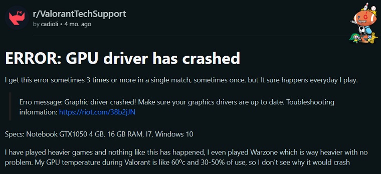 Afdækning af FPS i Valorant kan forhindre"Grafikdriver styrtede"fejl ifølge en kilde. På trods af at man kører en avanceret GPU som Nvidia RTX 3080, som kan køreVærdsættepå 600+ FPS blev brugeren tvunget til at begrænse sin FPS til 200. Ifølge brugeren uden hætten kørte GPU'en med max effekt for at opnå så høj FPS som muligt. På grund af GPU'en, der kører med maksimal effekt, blev den overophedet og resulterede i"Grafikdrivernedbrud"fejl. De nævnte også, at dette specifikke nedbrud kun forekommer i Valorant.