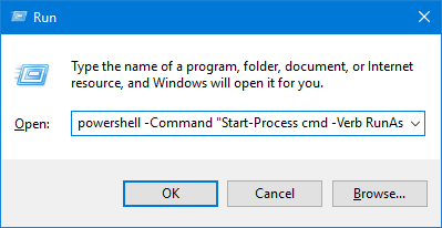 Brug Windows-tasten + R-tastaturkombinationen til at åbne dialogboksen Kør. Indtast følgende, og tryk på Enter.powershell -Command "Start-Process cmd -Verb RunAs