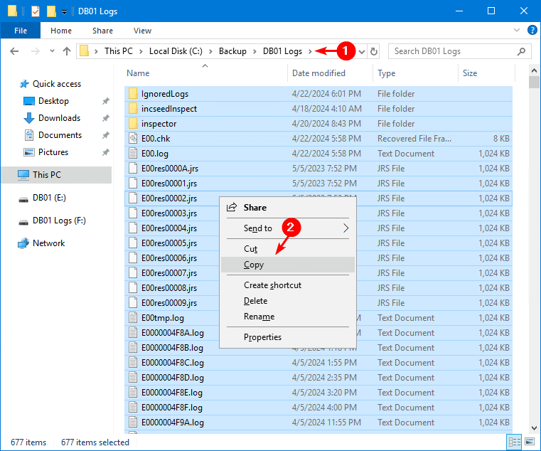 Kopier postkassedatabasenDB01 logfiler. Hvis du ikke har postkassedatabasens transaktionslogfiler, kan du springe dette trin over.
