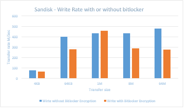 Fra graferne ovenfor kan vi se, at BitLocker ikke yder nogen ydelse ved læseoperation, men lidt på skriveoperation.