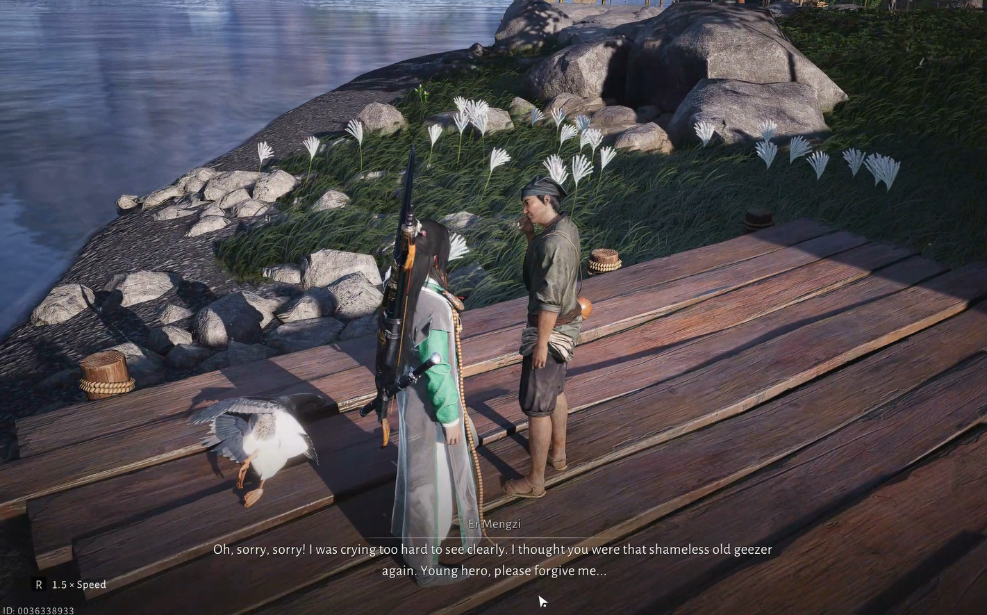 Tal med manden Er Mengzi. Han vil forklare, at hans gås druknede, fordi ældste Yang lavede en metalvinge til den, smart, men for tung, hvilket fik den stakkels gås til at synke.