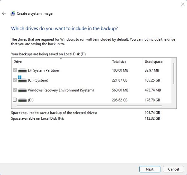 6. Når du har gennemført sikkerhedskopieringen, skal du klikkeNæste. Vælg de drev, du vil inkludere i sikkerhedskopien, på den næste skærm.