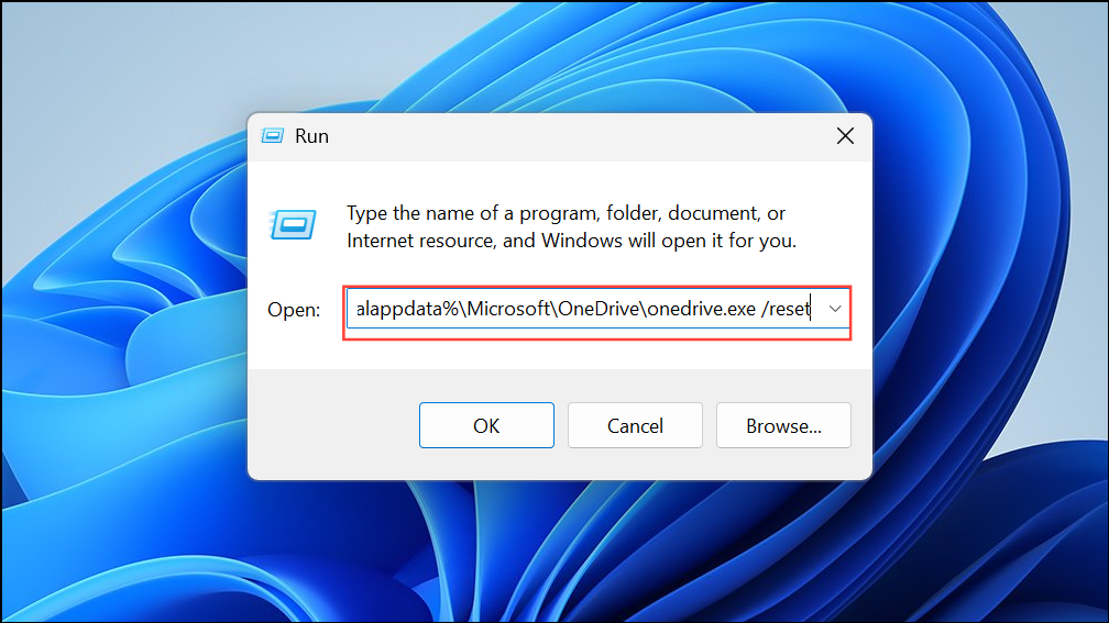 Trin 1:Hvis OneDrive ikke reagerer eller problemer fortsætter efter justering af indstillinger, skal du nulstille appen. Åbn dialogboksen Kør medWindows + R, indtast%localappdata%MicrosoftOneDriveonedrive.exe /reset, og tryk på Enter. Dette genstarter OneDrive og kan løse fastlåste synkroniserings- eller overførselsproblemer.