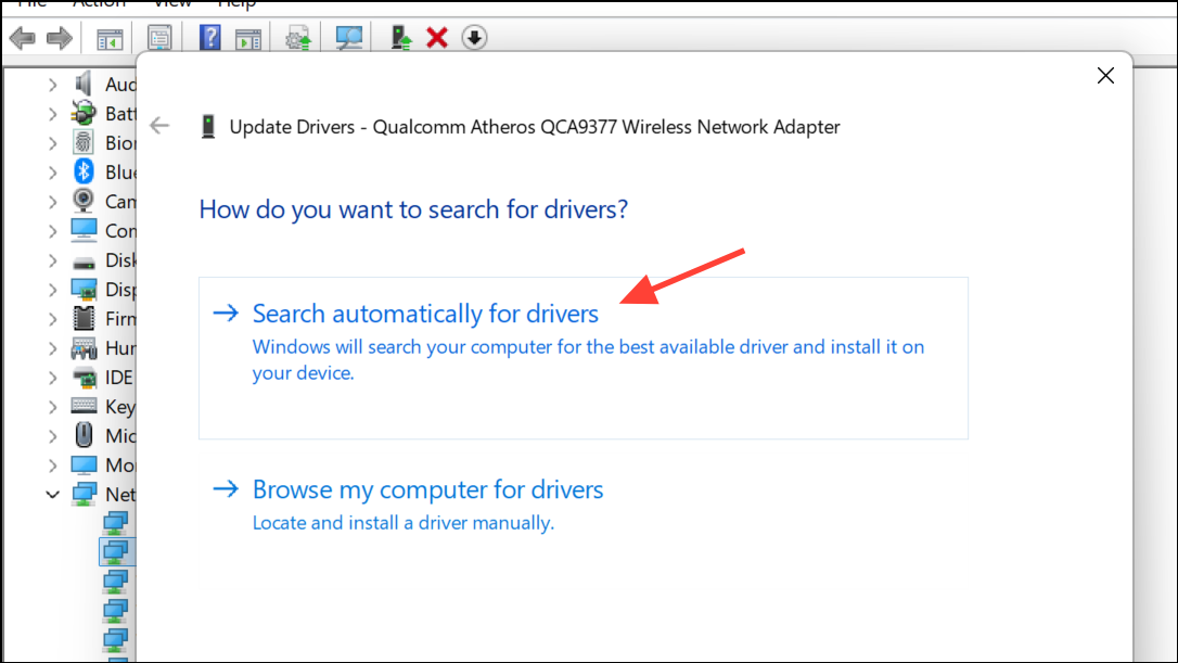 Trin 3:UdvideNetwork Adapters, højreklik på din aktive netværksadapter, og vælgUpdate driver. VælgeSearch automatically for driverseller installer den nyeste driver manuelt fra din hardwareproducents websted. Forældede eller beskadigede drivere får ofte Windows til at fejlrapportere netværksstatus.