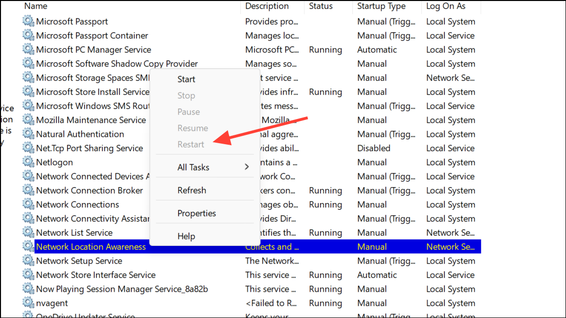 Trin 2:Find i vinduet TjenesterNetwork Location AwarenessogDHCP Client. Højreklik på hver og vælgRestart.