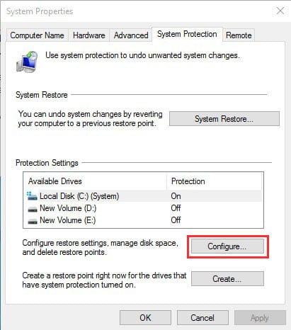 3. Du skal aktivereSlå systembeskyttelse til, indstil Max Usage-niveauet til 5 -10 %, og tryk på Anvend.